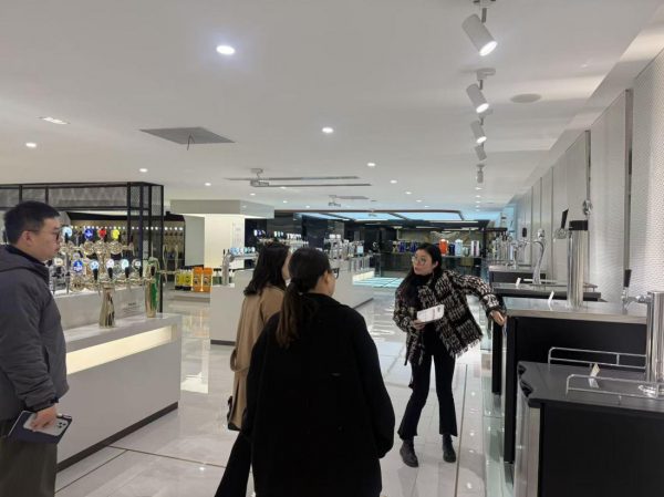 图:Bob Zou 会长(右一)在塔罗斯科技股份有限公司,体验其先进的饮料分发系统,并对企业创新能力表示赞赏。